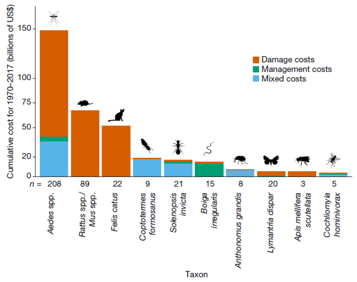 [1] Bradshaw, C. J., Leroy, B., Bellard, C., Roiz, D., Albert, C., Fournier, A., Barbet-Massin, M., Salles, J.-M., Simard, F., Courchamp, F. (2016). Massive yet grossly underestimated global costs of invasive insects. Nature communications, 7(1), 1-8.