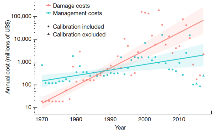 Fig.1. Evolution des coûts des dommages et de la gestion des espèces invasives à l’échelle mondiale
