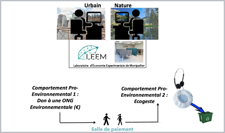 We test this causal link as part of a laboratory experiment where subjects watch either a video presenting an urban environment (“urban” control treatment), or a video presenting a natural environment (“nature” treatment). We consider two types of pro-environmental behavior: a monetary decision, corresponding to a donation to a pro-environmental non-governmental organization (Environmental NGO), and, after this, a non-monetary decision, in this case a gesture of recycling hygienic caps for earphones/headphones (Figure 1).