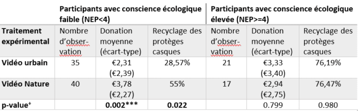 Indeed, as shown in Table 1, we observe that, for individuals with low ecological awareness, viewing a video on nature increases the donation by 1.47€ on average, and increases the number of people who recycle headphone protectors by 26.53%